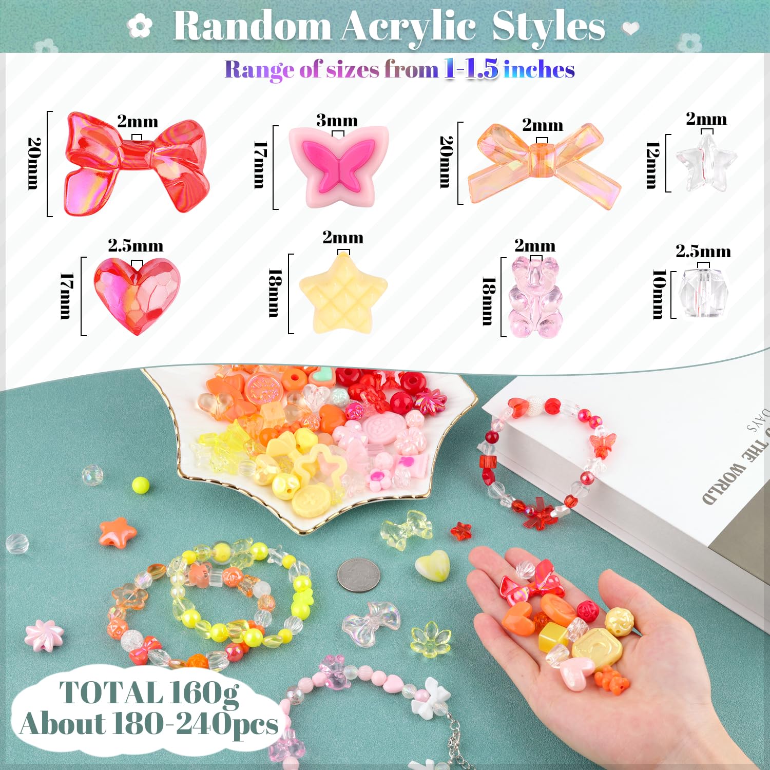 - PACKAGE CONTENT - Includes four color series of beads,totaling 160 grams (about 180-240 pcs). This set features transparent, jelly, iridescent, glitter and solid color effects. Along with shapes like hearts, butterflies, bows,gummy bears and more