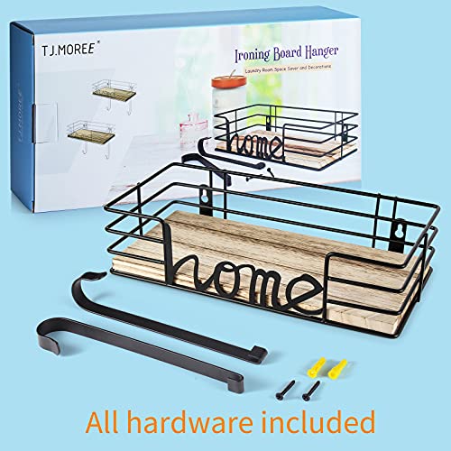 TJ.MOREE Ironing Board Hanger Wall Mount with Large Storage Wooden Base Basket and Removable Hooks (Black) For Laundry Room