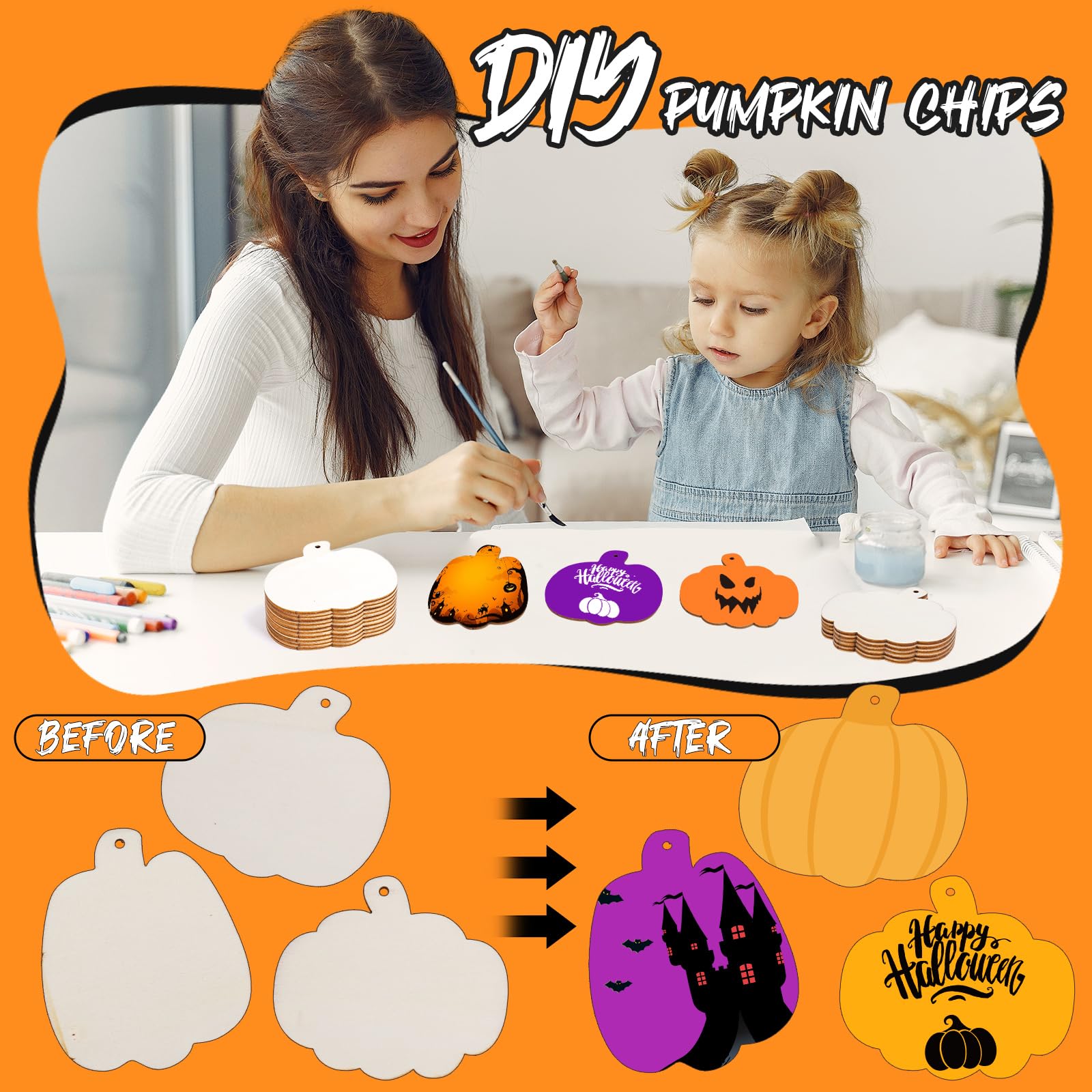 Pumpkin 30Pcs Unfinished Wooden Ornaments Halloween Thanksgiving Autumn Paintable Blank Pumpkin Cutouts Hanging Wood Slices DIY Craft for Kids Art Crafts Party Supplies