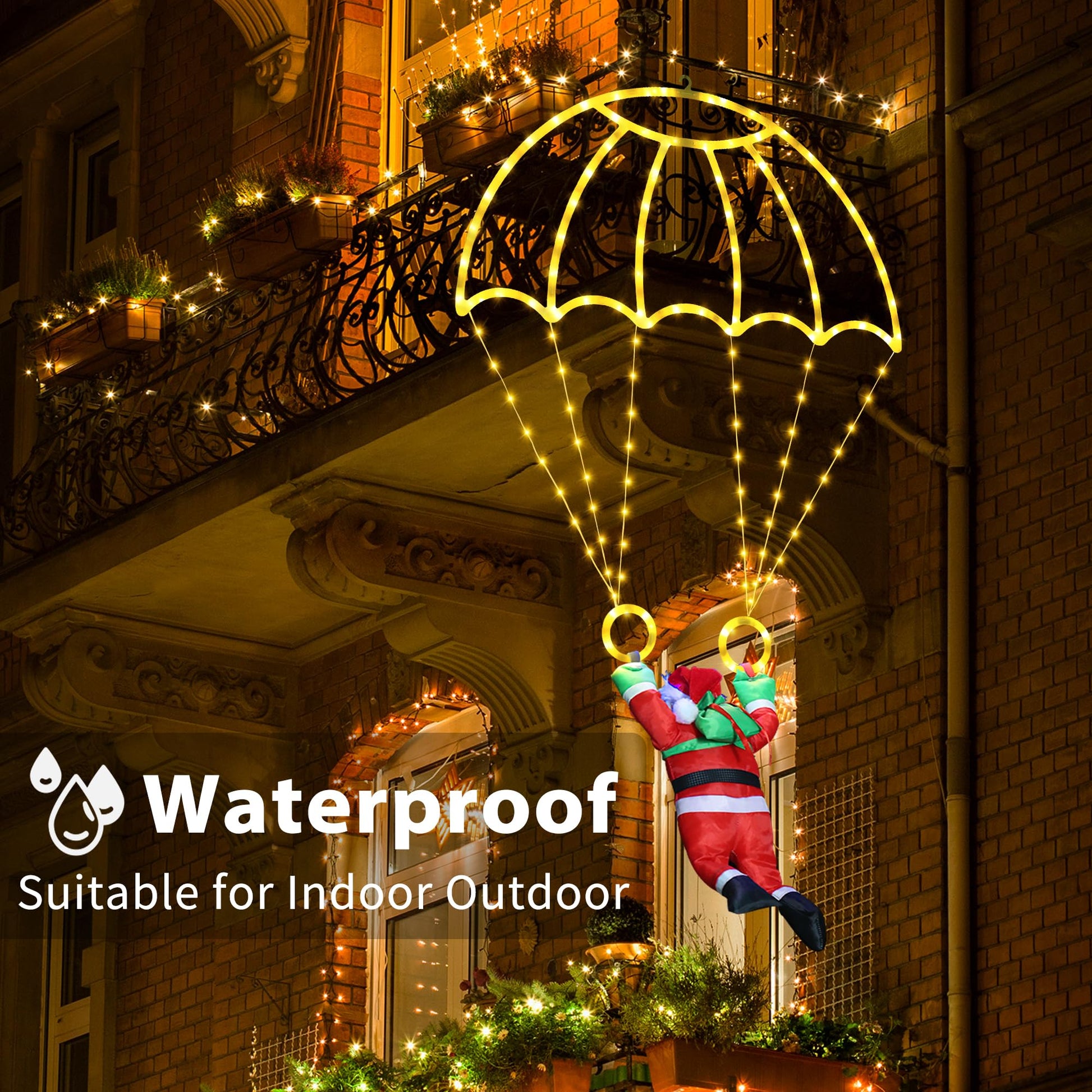 - 🪂Newest Exclusive Release Christmas Parachute Lights : Unique-designed Christmas lights composed of a 2.8 * 2.3ft lighted parachute and a 1.3ft detachable santa, will add a lot of festive atmosphere for your Christmas. The xmas decorative lights is popular and fashionable to your yard, garden, window, wall, roof, eave, balcony decor.
