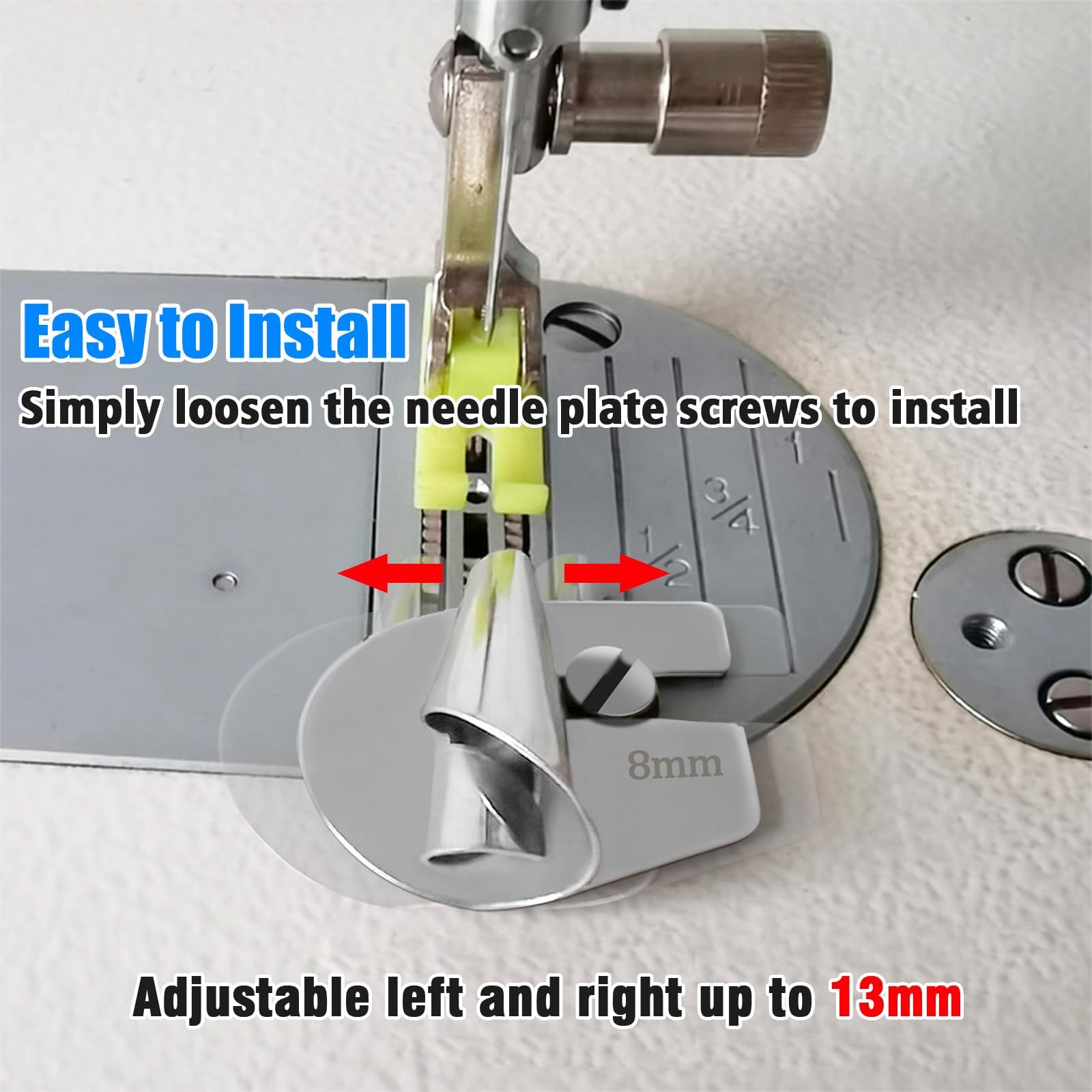 - 【Easy to Install】1.The placement direction of the universal sewing hemp feet is shown in the figure.2.The card slot corresponds to the hole on the card Needle plate of sewing machine 4 Fix with needle plate screws.3.Insert the edge of the fabric into it Larger spiral hole, start sewing 4.After sewing is completed, you will receive The effect is shown in the picture.