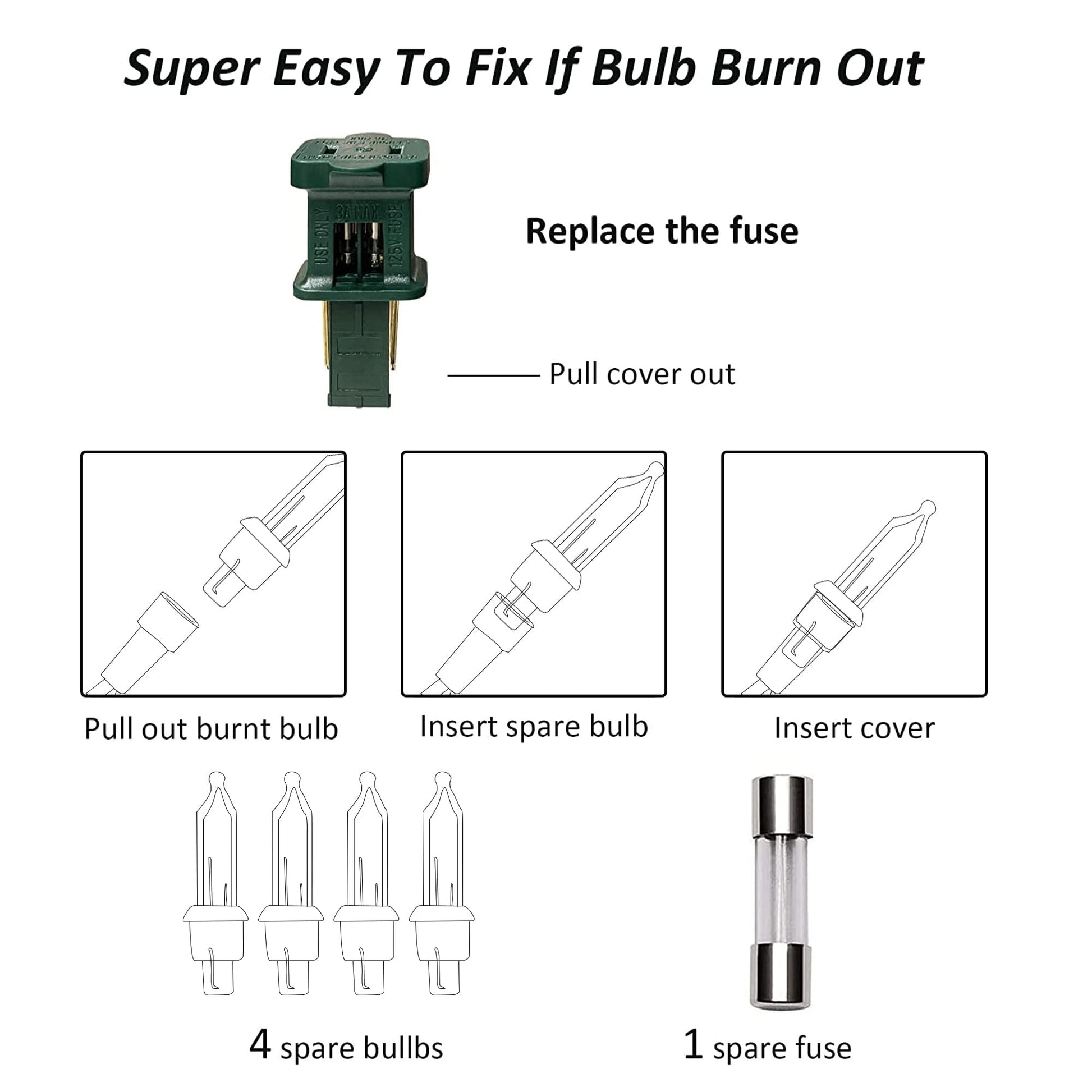 - High Quality: The Christmas tree lights is IP 44 waterproof, build-in 3A fuse and pass with UL certified, is safety for both indoor and outdoor decorations. Each bulb works individual, others will work well when one bulb is defective. Just use the spare bulbs to replace the defective bulb.
