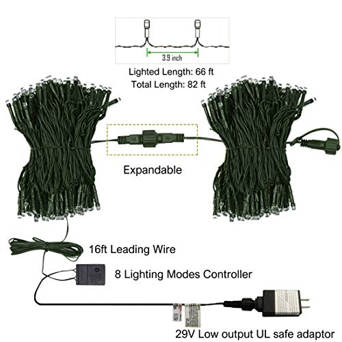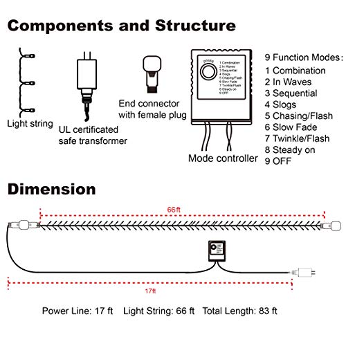 - 8 Mode Functions- 8 Mode Functions to fit different occasions, moods, feelings, holidays, festivals, anniversaries, etc. (Combination, In waves, Sequential, Slow Glow, Chasing/Flash, Slow fade, Twinkle/Flash, Steady on). Adjust the lighting modes by pressing the round button on the mode controller.