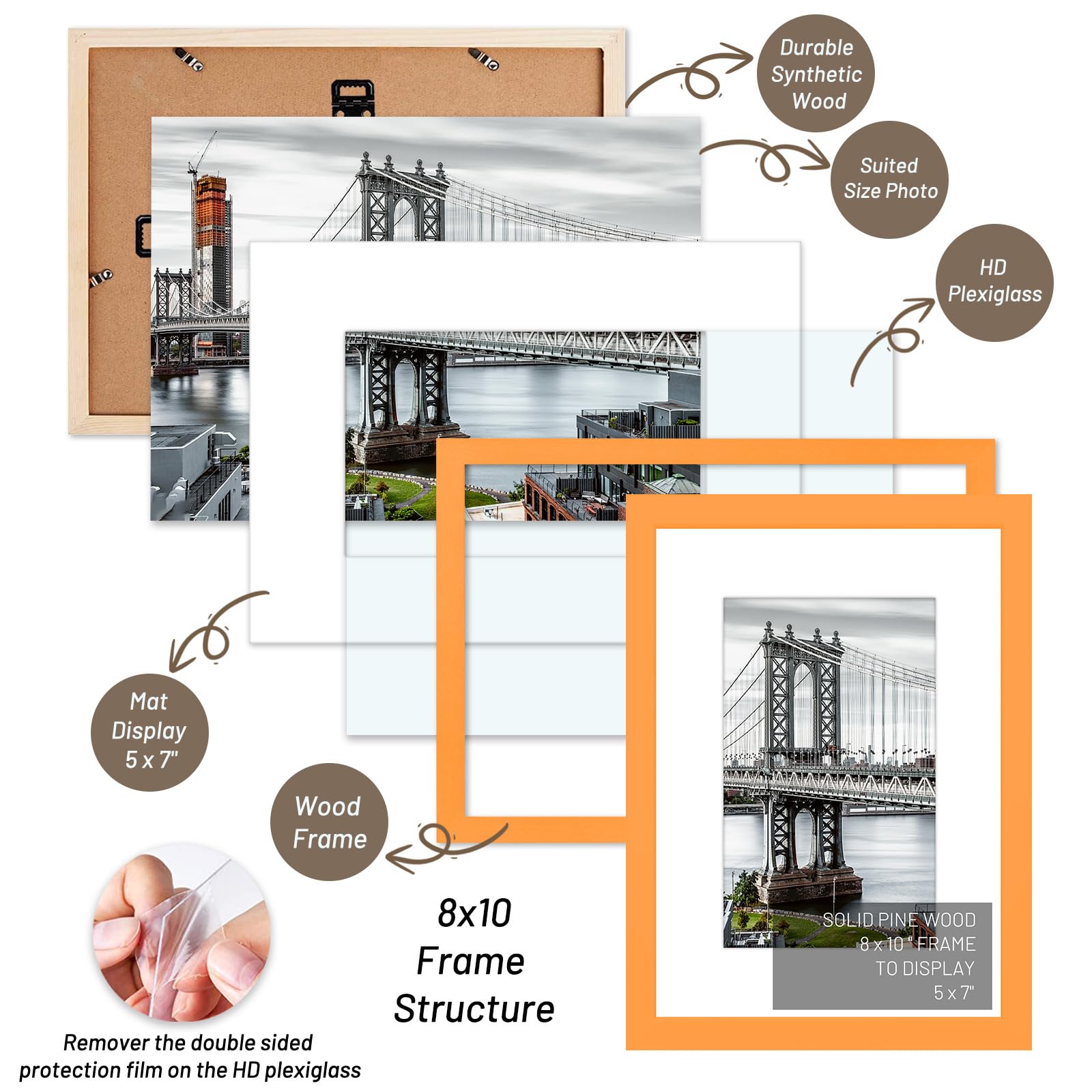 8x10 Picture Frames Solid Wood Display Pictures 5x7 with Mat or 8x10 Frame without Mat Poster Photo Frame Art with 1 Mats for Wall Mounting or Table Top(Orange)