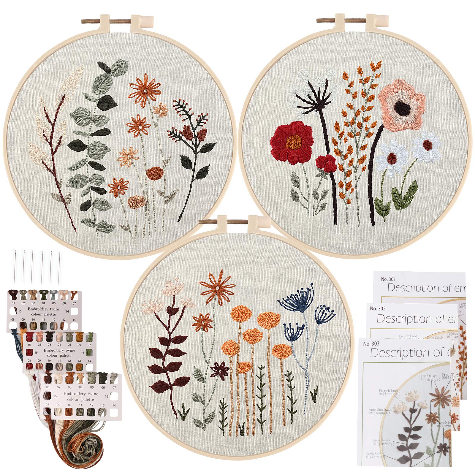 Uphome 3 Pack Embroidery Starter Kit for Beginners Stamped Cross Stitch Kits with Cute Flowers and Plants Patterns with 1 Embroidery Hoop and Color Threads for Adults Kids