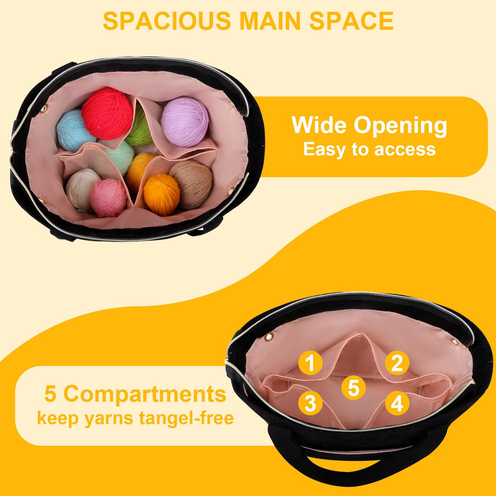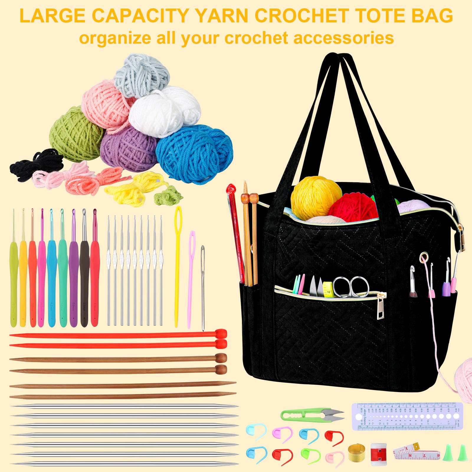 Crochet Bag Organizer for Yarn Storage, Velvet Knitting Tote Bag with Double Handle for Crochet Accessories, Portable Travel Case for Yarn Balls, Crochet Hooks& Knitting Needles Holder (Black)
