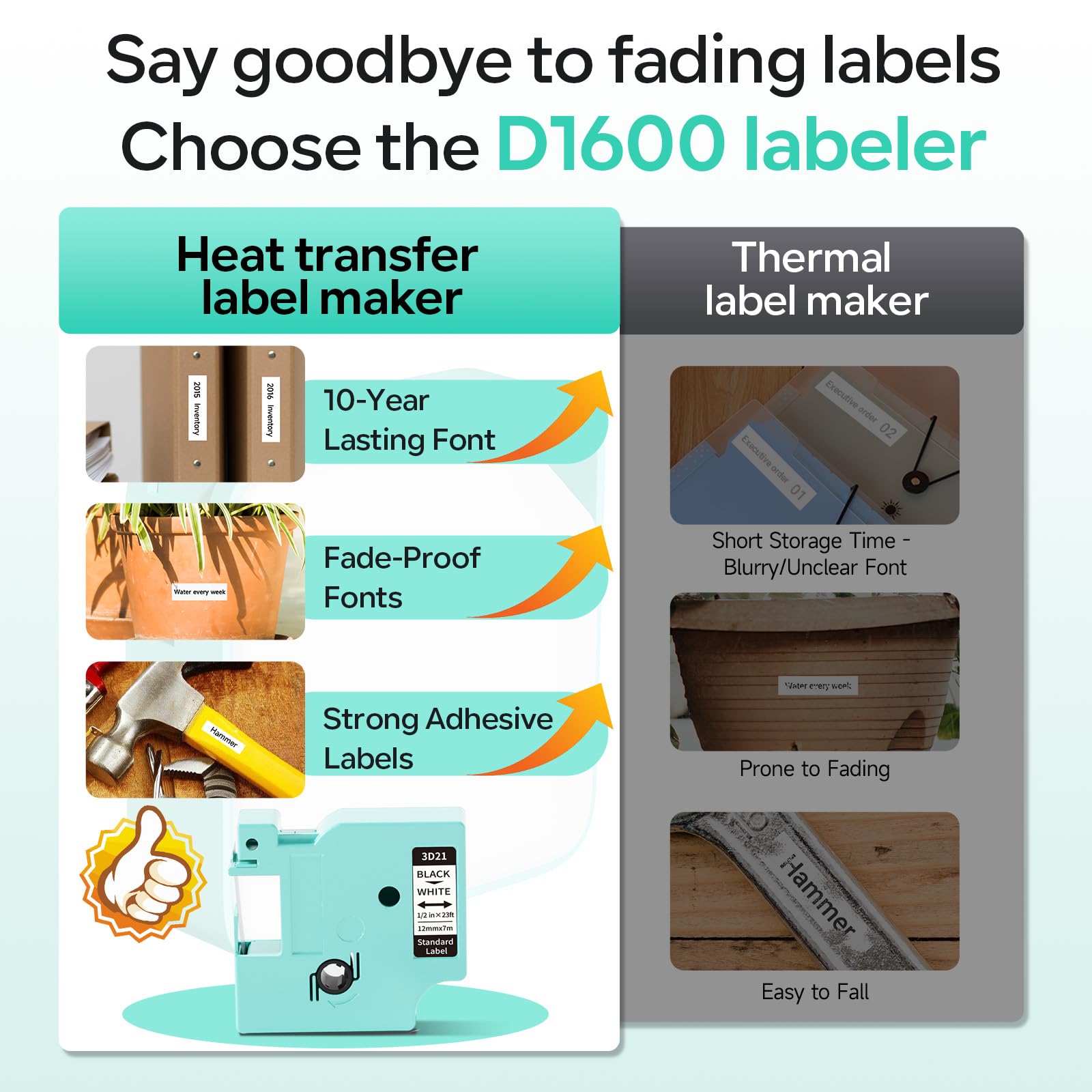 - Durable label maker tape - Utilizing thermal transfer printing, D1600 label maker machine with tape are fade-resistant, smudge, scratch-resistant, strongly self-adhesive and has a split back for easy to peal. These labels are perfect for both indoor and outdoor use. Labeler Machine with Tape comes with a 1-Pack black on white label tape. Size:1/2 inch x 13 feet