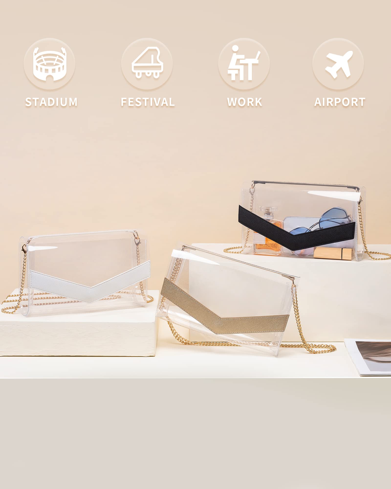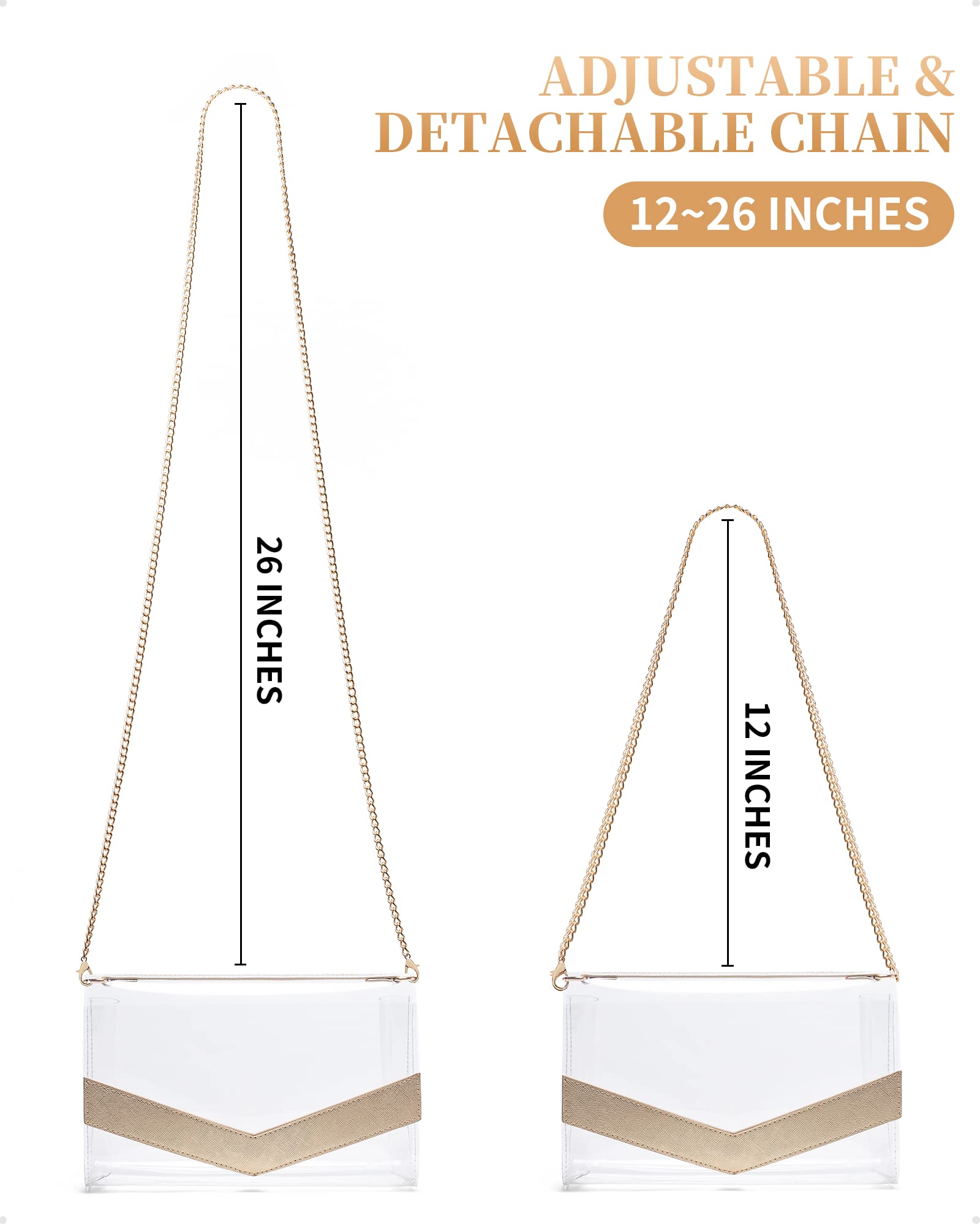- Adjustable & detachable chain: The chain strap of the clear purse is detachable and adjustable which is long enough to wear cross body, you can adjust the chain strap to any size according to your body shape. It also can be used as shoulder bag, crossbody bag, or removed to be brief handbag