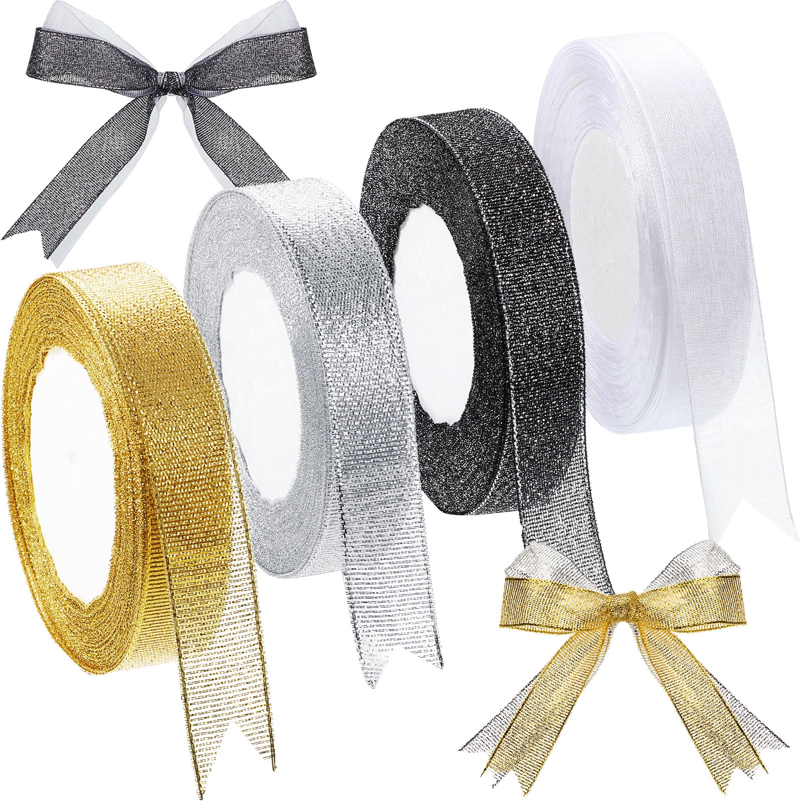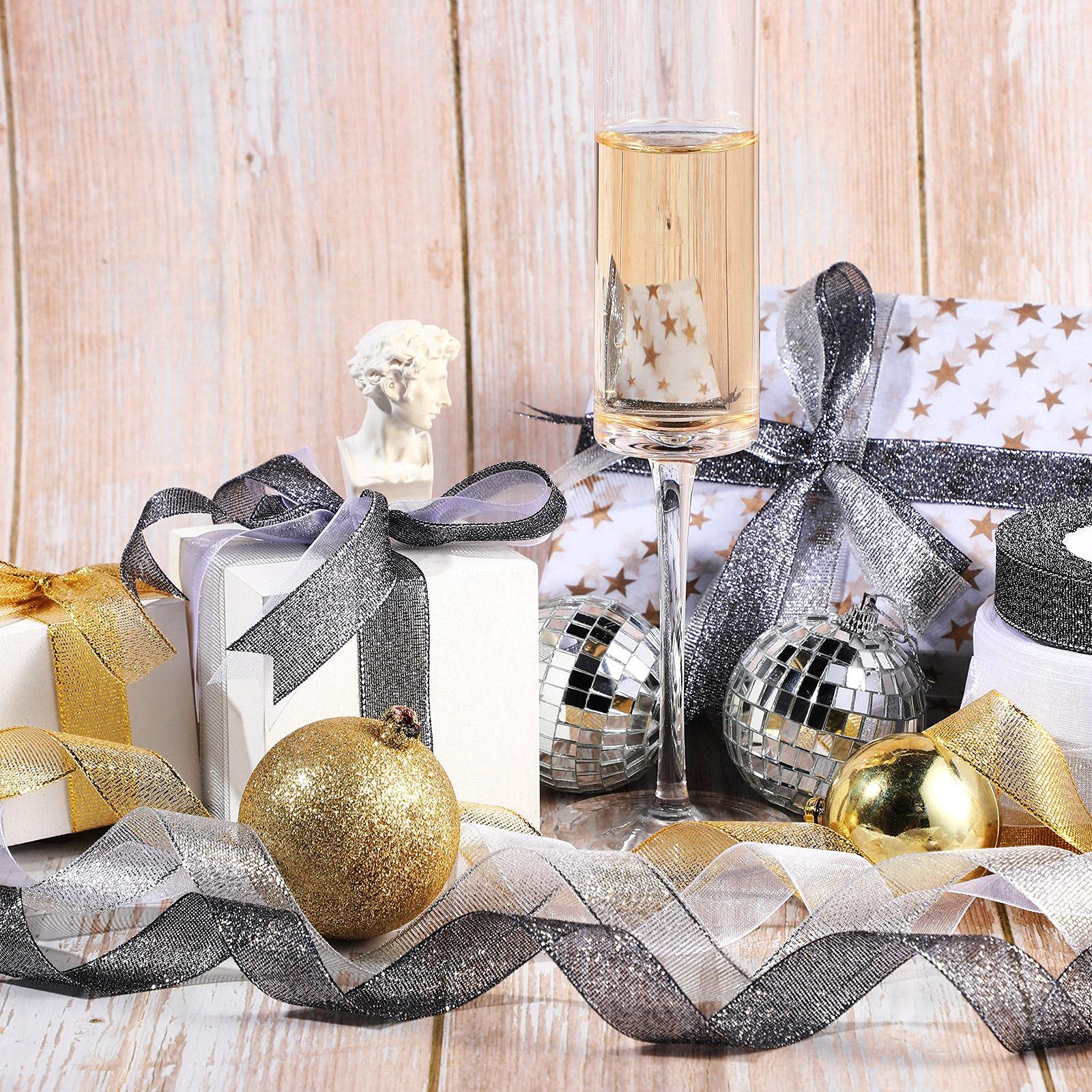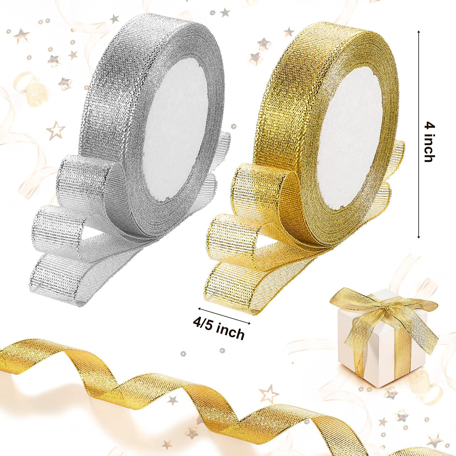 3 Rolls 25 Yards 4/5 Inch Glitter Metallic Ribbons and 1 Roll 50 Yards 4/5 Inch Organza Ribbon Golden Silver Glitter Ribbon for Gift Wrapping Wedding Birthday Party Christmas Decoration