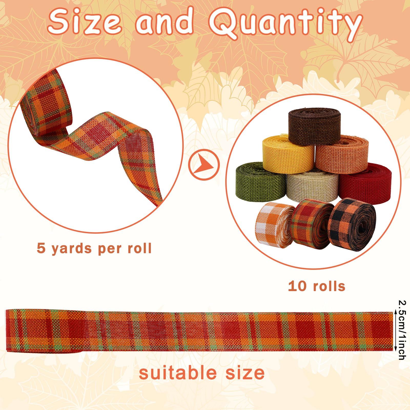 - Size - Each ribbon roll measures about 2.5 cm/1 inch in width and 5 yards in length, 50 yards in total, long enough to satisfy your needs for decoration and crafts making.