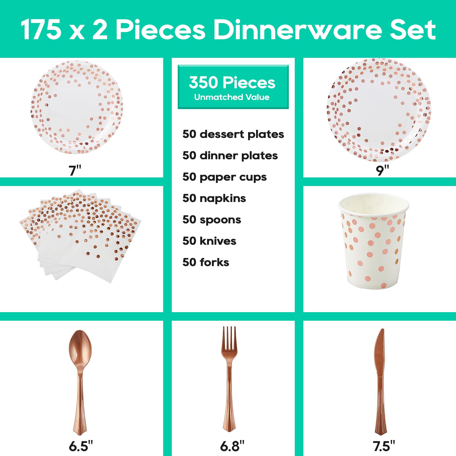 - 🌟🌟350 PIECE PARTY DINNERWARE SET - This set includes 50 9" disposable paper dinner plates, 50 7" paper dessert plates, 50 9oz paper cups, 50 6.5" paper napkins, and a heavy-duty rose gold plastic cutlery set (knives, spoons, forks). Enough to serve 50 guests at once