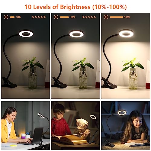 Woputne Desk Clip on Lamp for Reading Home Office, 10 Dimmable Brightness 3 Modes, Ring/ Clamp Light for Bed Headboard, Craft, Computer, Video Call