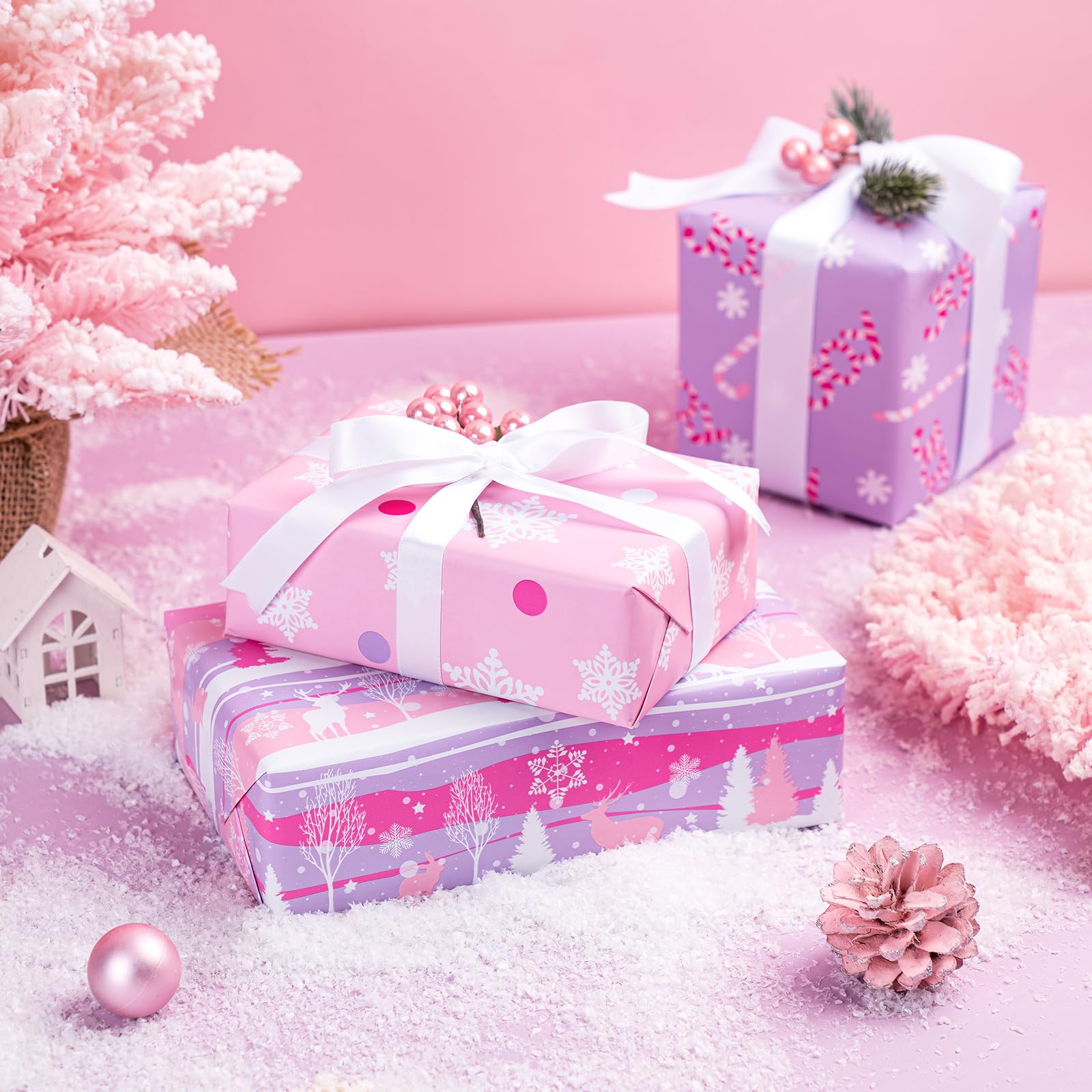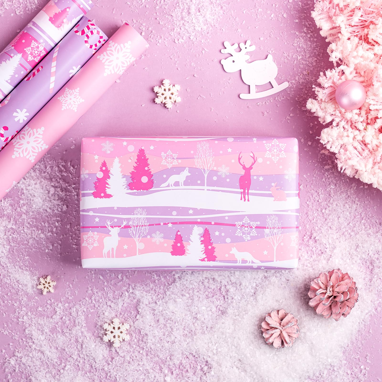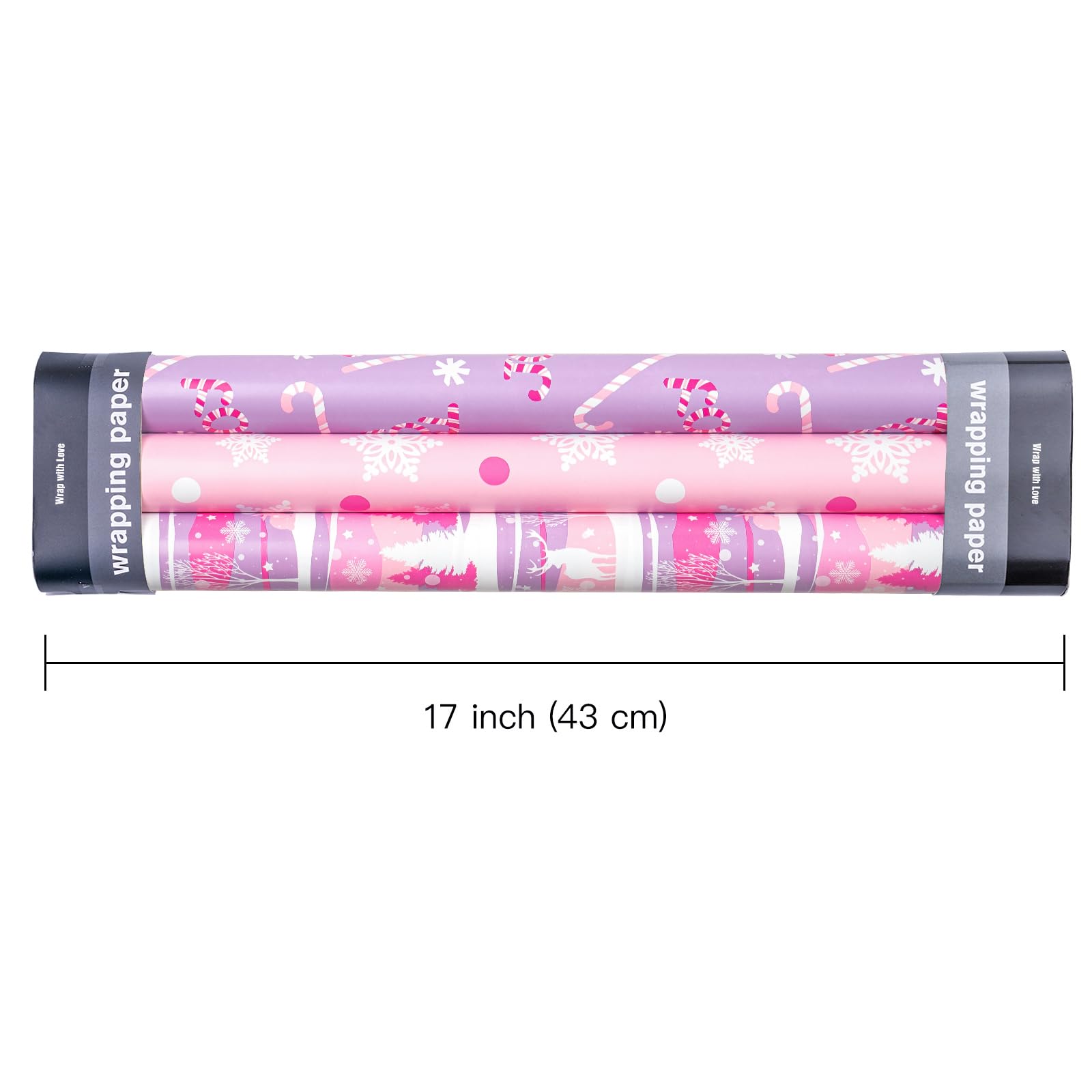 Christmas Wrapping Paper Roll - Mini Roll - 3 Rolls - 17 Inch X 120 Inch Per Roll - Pastel Pink and Purple Reindeer, Candy Cane with JOY, Snowflake Holiday Collection