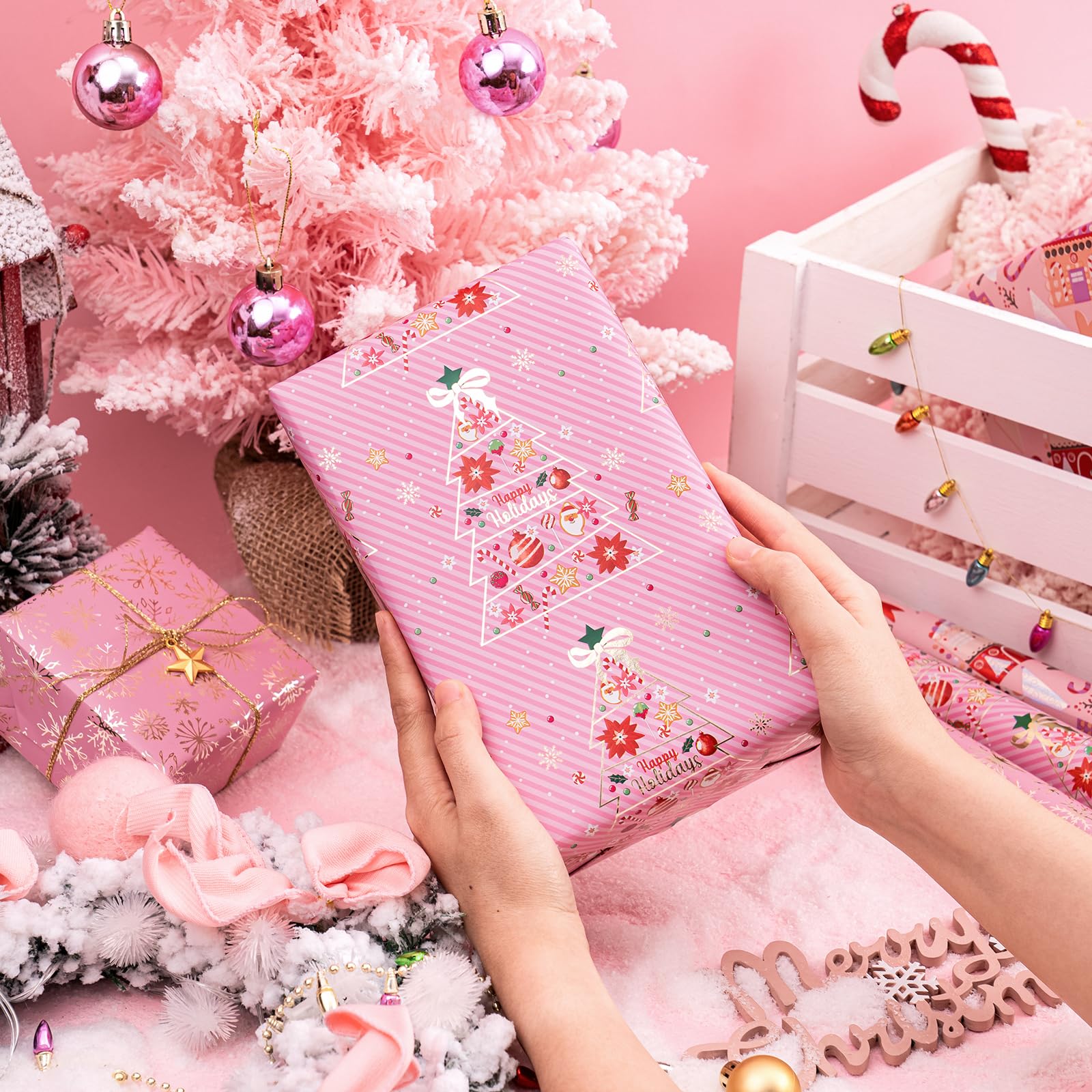 Christmas Wrapping Paper Roll - Mini Roll - 3 Rolls - 17 Inch X 120 Inch Per Roll - Pink Christmas tree, House, Snowflake Holiday Collection