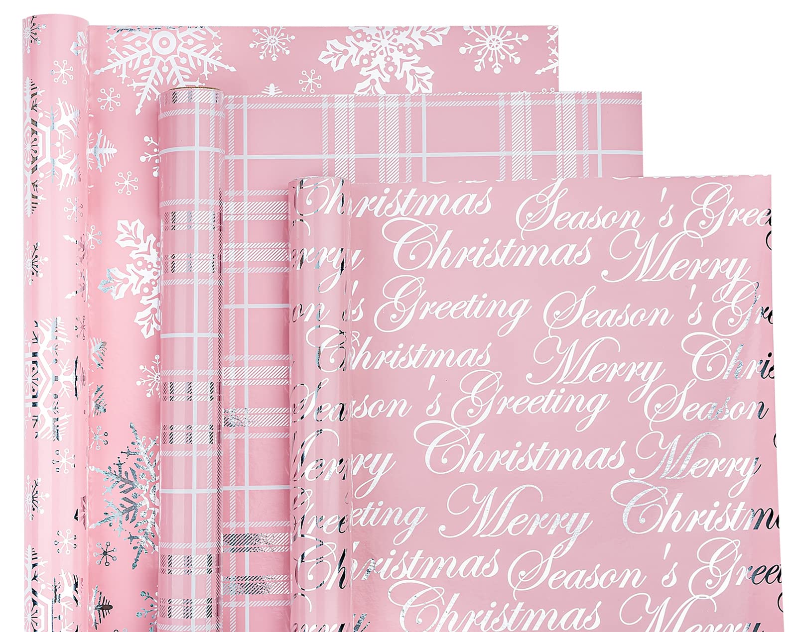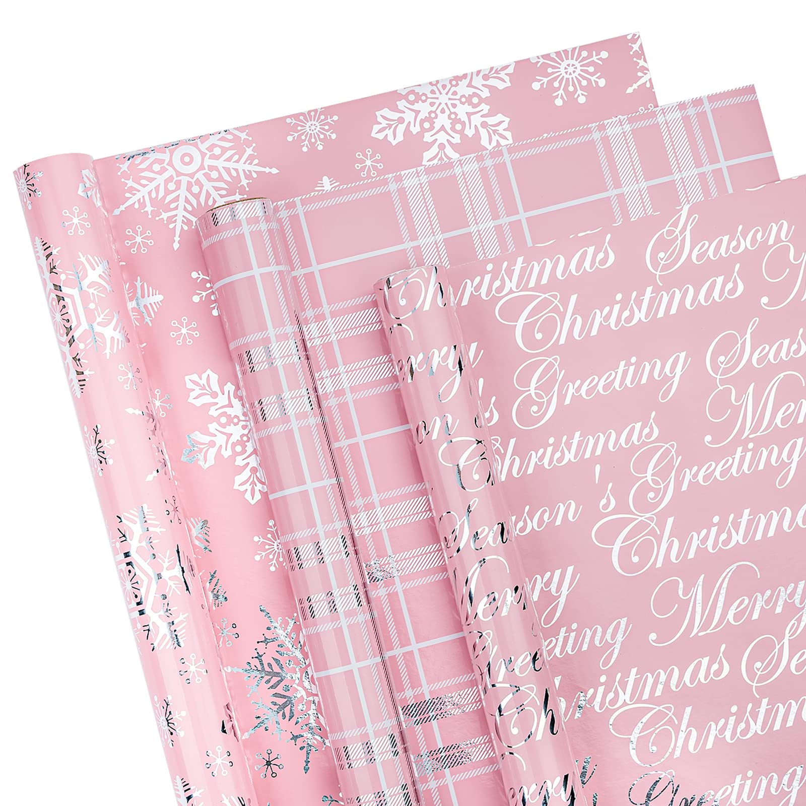 Christmas Wrapping Paper Roll - Mini Roll - 3 Rolls - 17 Inch X 120 Inch Per Roll - Pink with Silver Metallic Foil Snowflake, Plaid, Merry Christmas Lettering