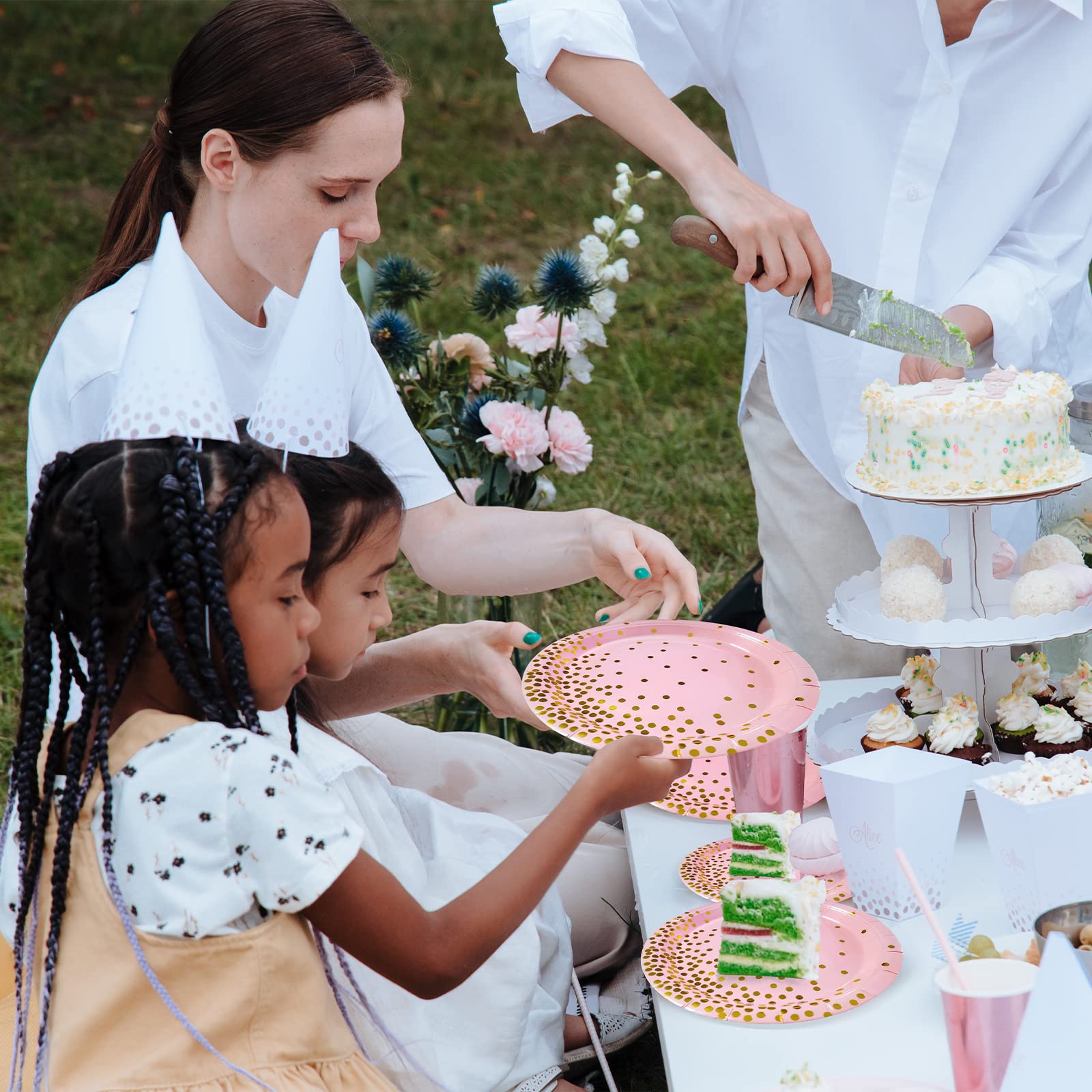 - The disposable paper plates is made of 350gsm thickened environmentally friendly paper,and the soak-proof layer on the surface,Cut resistant and Soak-Proof,pink napkins are 2-ply,soft and absorbent.(NOTE: Do not microwave the disposable tableware)