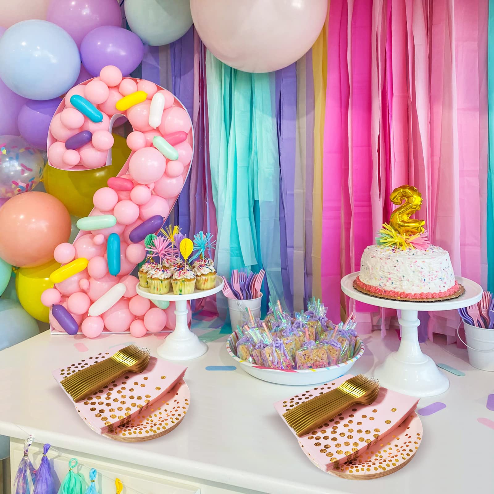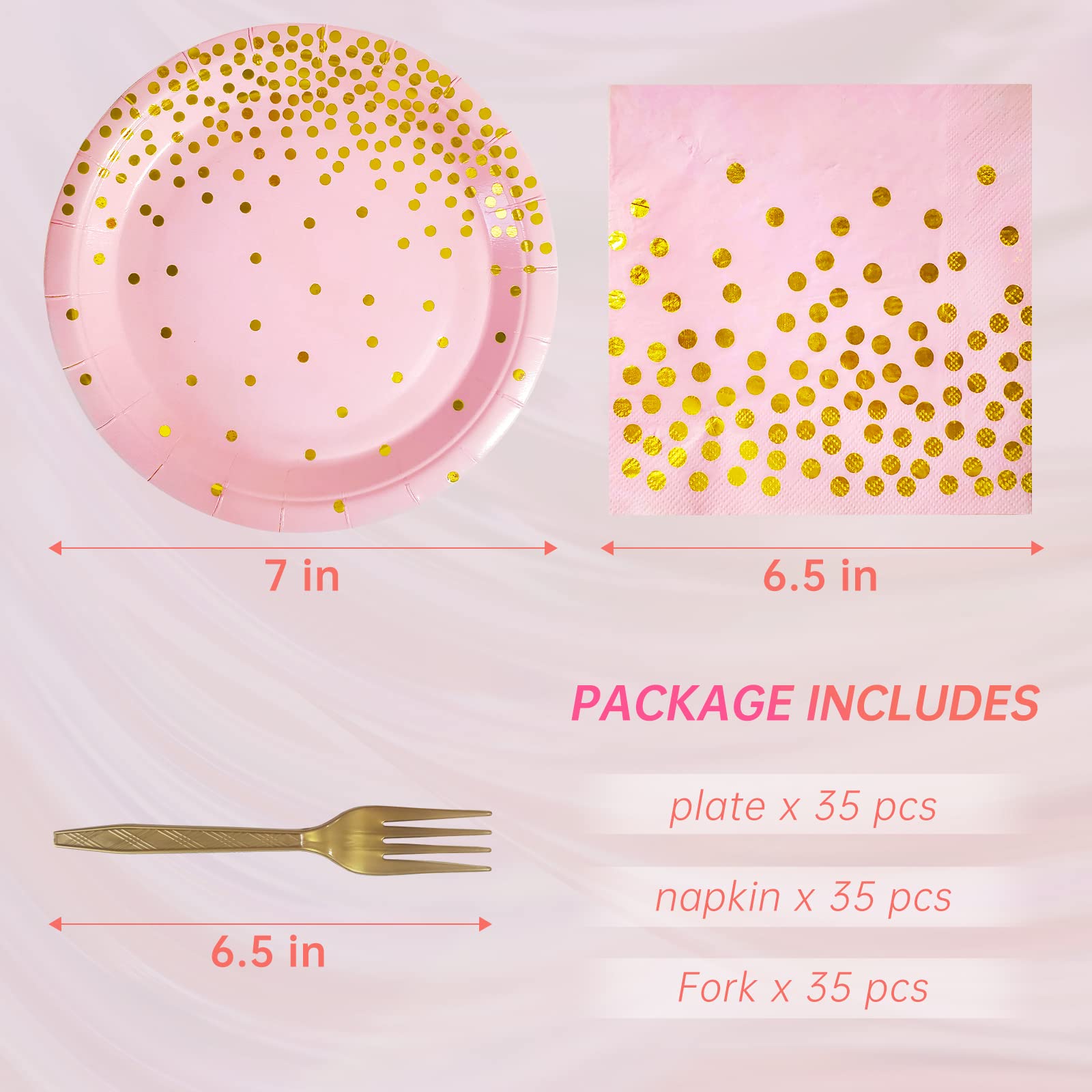 - The pink party plates and napkins sets include,35 7"dessert plates, 35 napkins, 35 fork,pink and gold party supplies can serve 35 persons at the same time.