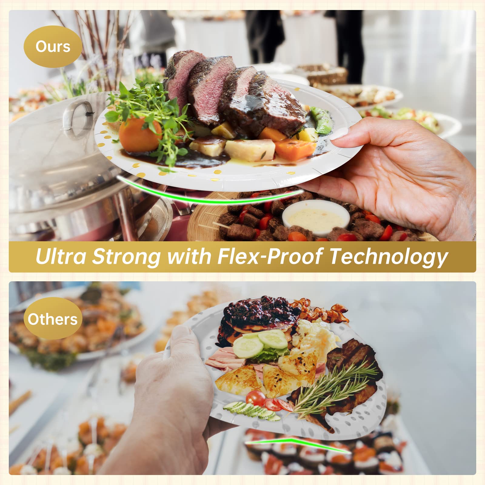 - The disposable paper plates is made of thickened environmentally friendly paper,and the soak-proof layer on the surface,Cut resistant and Soak-Proof,white and gold napkins are 2-ply,soft and absorbent.(NOTE: Do not microwave the disposable tableware)