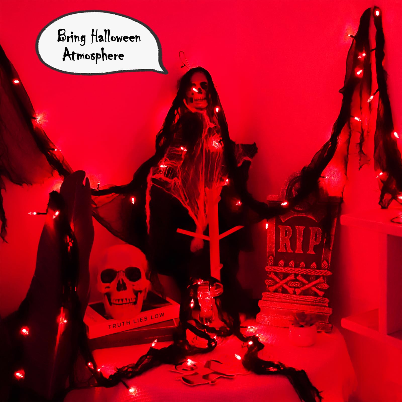 - Unique Design: 30LED String Lights with 9.9Ft black gauze, glowing red light in dark,create a Halloween scene for trick or treaters,truck or treat.