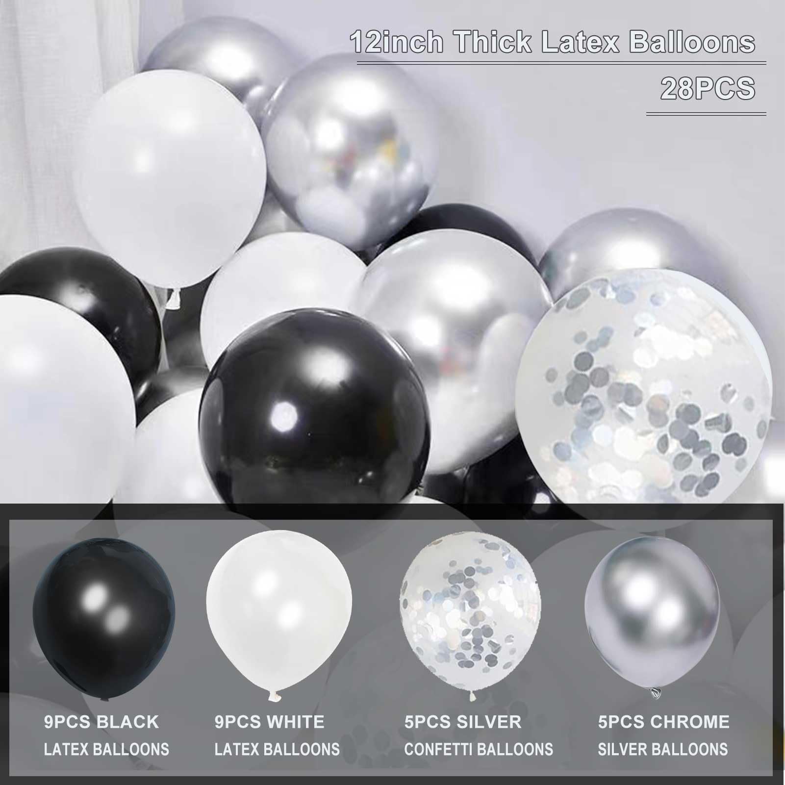 - 🎈【Diverse Balloon Collection】- This set includes 28 sturdy latex balloons measuring 12 inches each, in black, white, and metallic silver, plus captivating confetti patterns, complete with a 33-foot ribbon for stylish arrangement.