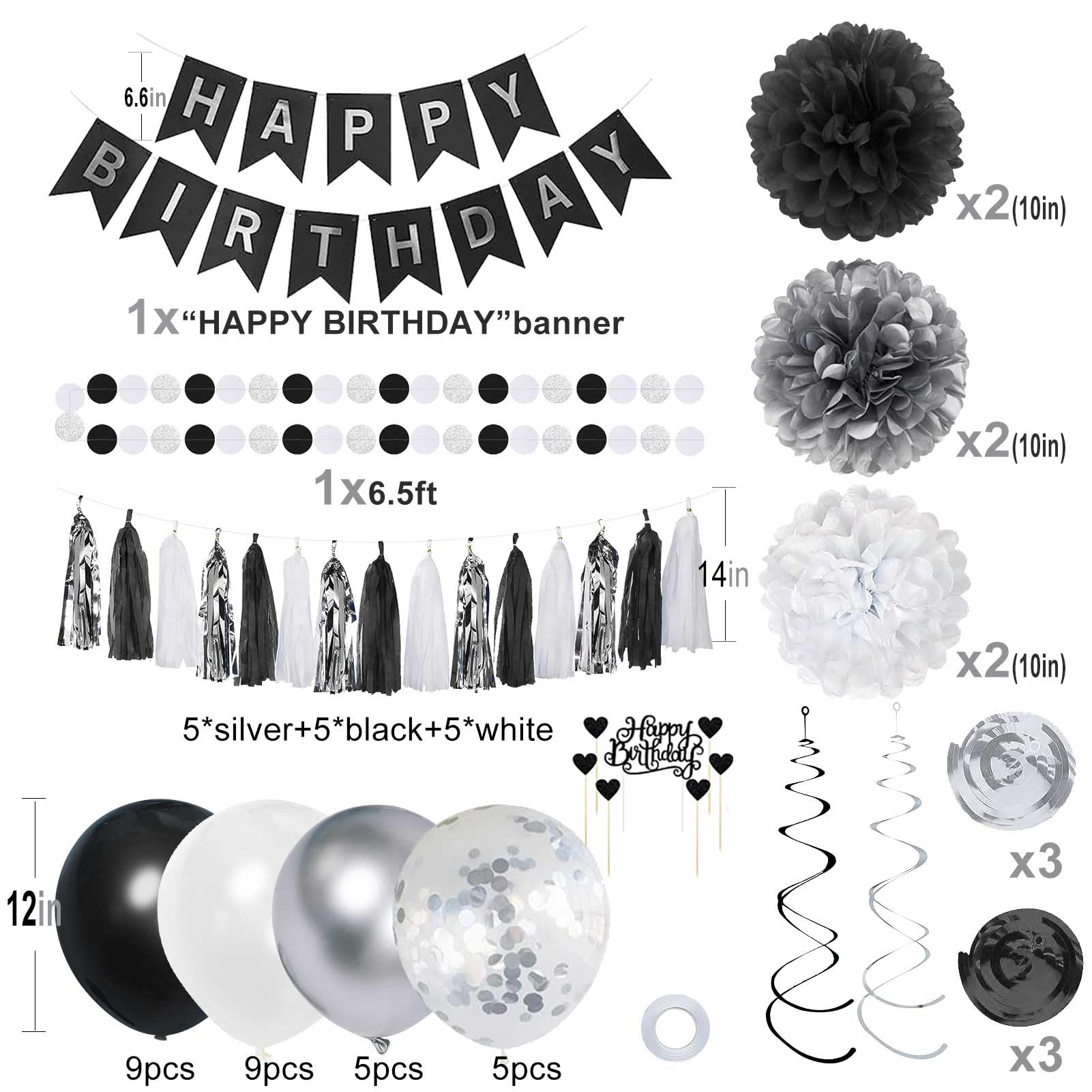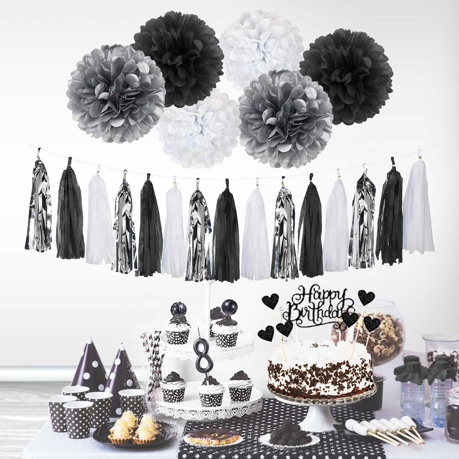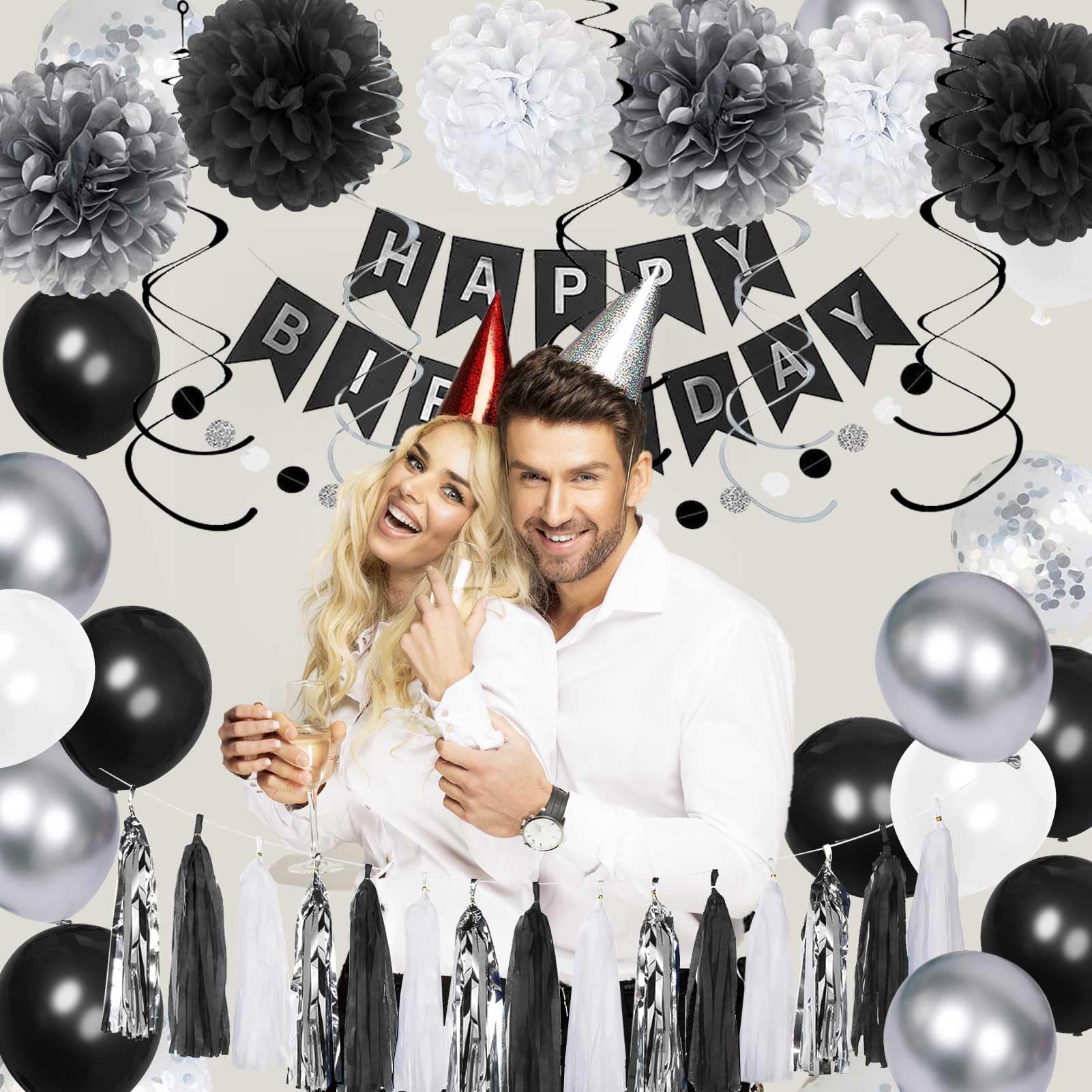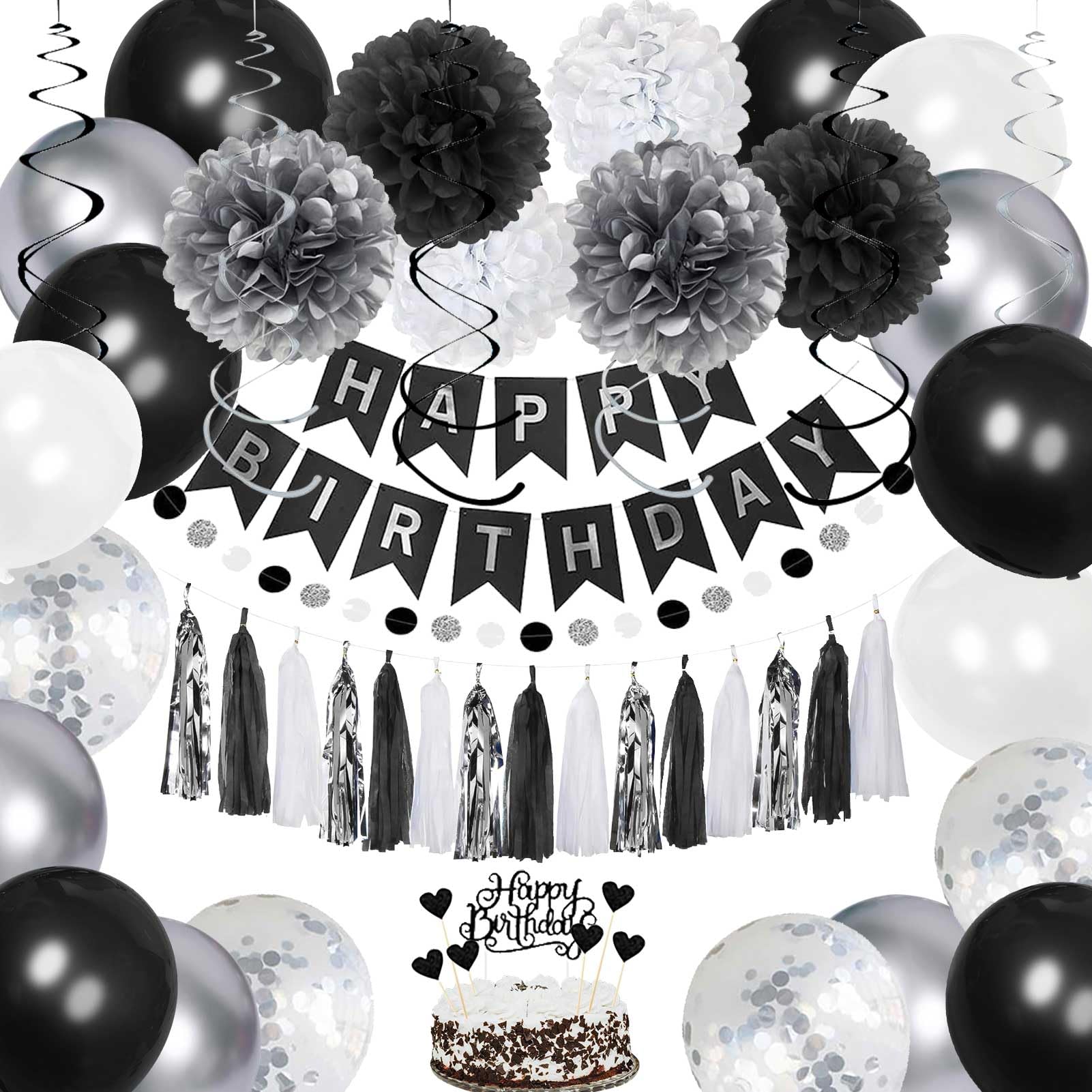 YGYXMY Birthday Decorations for Men | Black and Silver Happy Birthday Party Decorations | Black and White Birthday Party Supplies | Banner, Balloons, Tissue Pompoms, Swirls, Tassels Garland