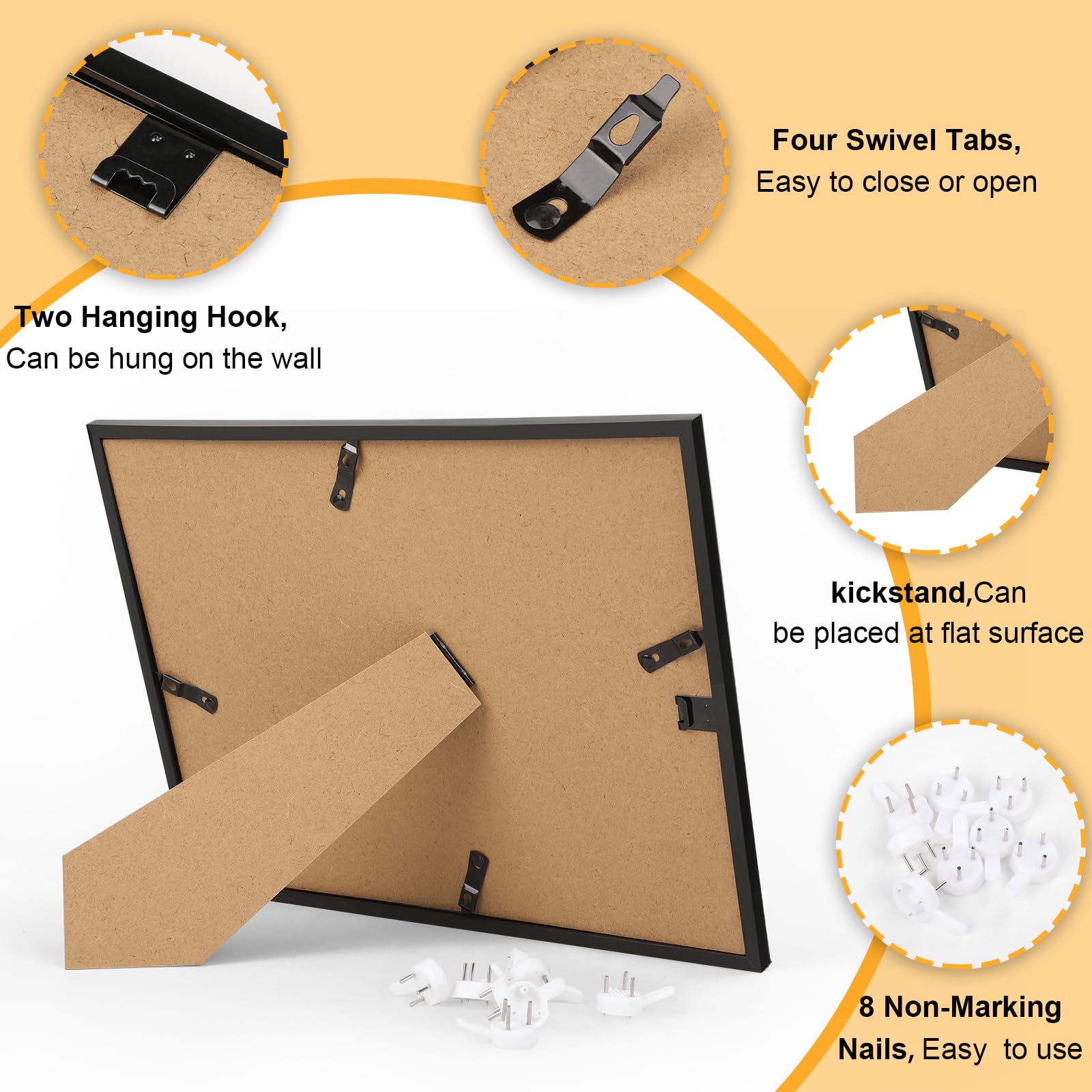- EASY INSTALLATION: 4 rotating buttons on the back for easy opening and closing. Either hang horizontally or vertically with non-marking peg hooks, or use the back easel to display on a table or desktop.