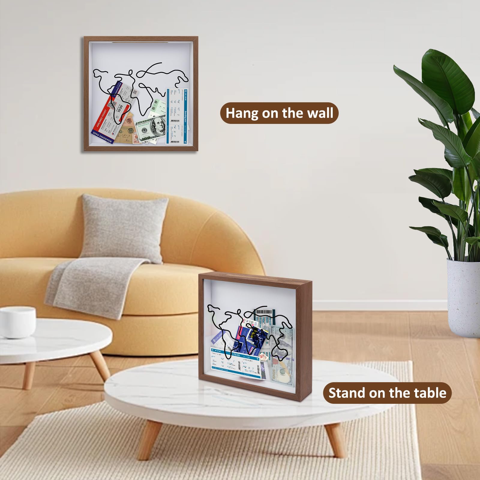 - 👍 【Shadow Box with Slot】: The sturdy medium-density fiberboard frame with a wood texture finish, durable and stylish. The clear acrylic front panel with a world map pattern adds a touch of elegance to your space. This innovative shadow box features a convenient slot at the top for effortlessly adding your souvenirs and memorabilia.