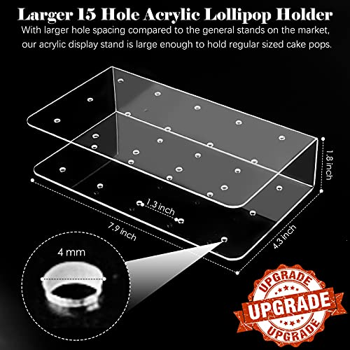 - These sturdy and beautiful acrylic lollipop holders are perfect for displaying your handmade cake pops. ▶Larger than other lollipop holders on the market, wider hole spacing ▶Double layer with 15 holes, help lollipop sticks stand upright and prevent them from swinging side to side ▶Crystal clear, make your lollipops more attractive ▶Thick and durable, not easy to break Package includes: 2 x 15-hole clear acrylic lollipop holder 50 x packaging bags 50 x lollipop sticks 50 x gold metallic twist tie Dimension of upgraded lollipop holder: Size: 7.8" (L) x 4.3" (W) x 1.8 "(H) Diameter of the hole: 4mm Hole spacing: 1.3inch/34mm Thickness: 2mm