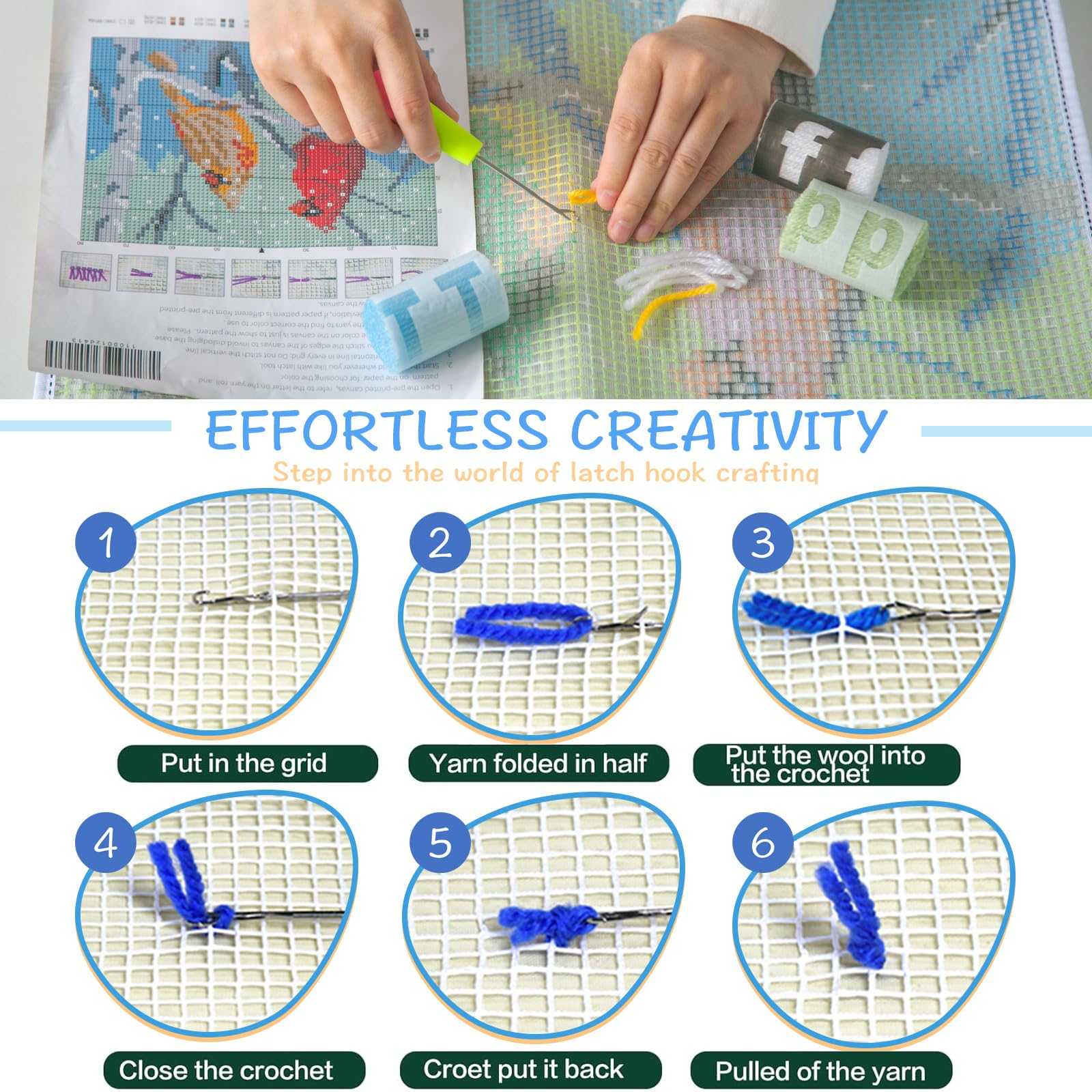 - Includes Everything--- Weve provided you with all of the tools you need to create plush textured mini-rugs. With a printed canvas, instructions, yarn and a crochet hook you can get started right away!
