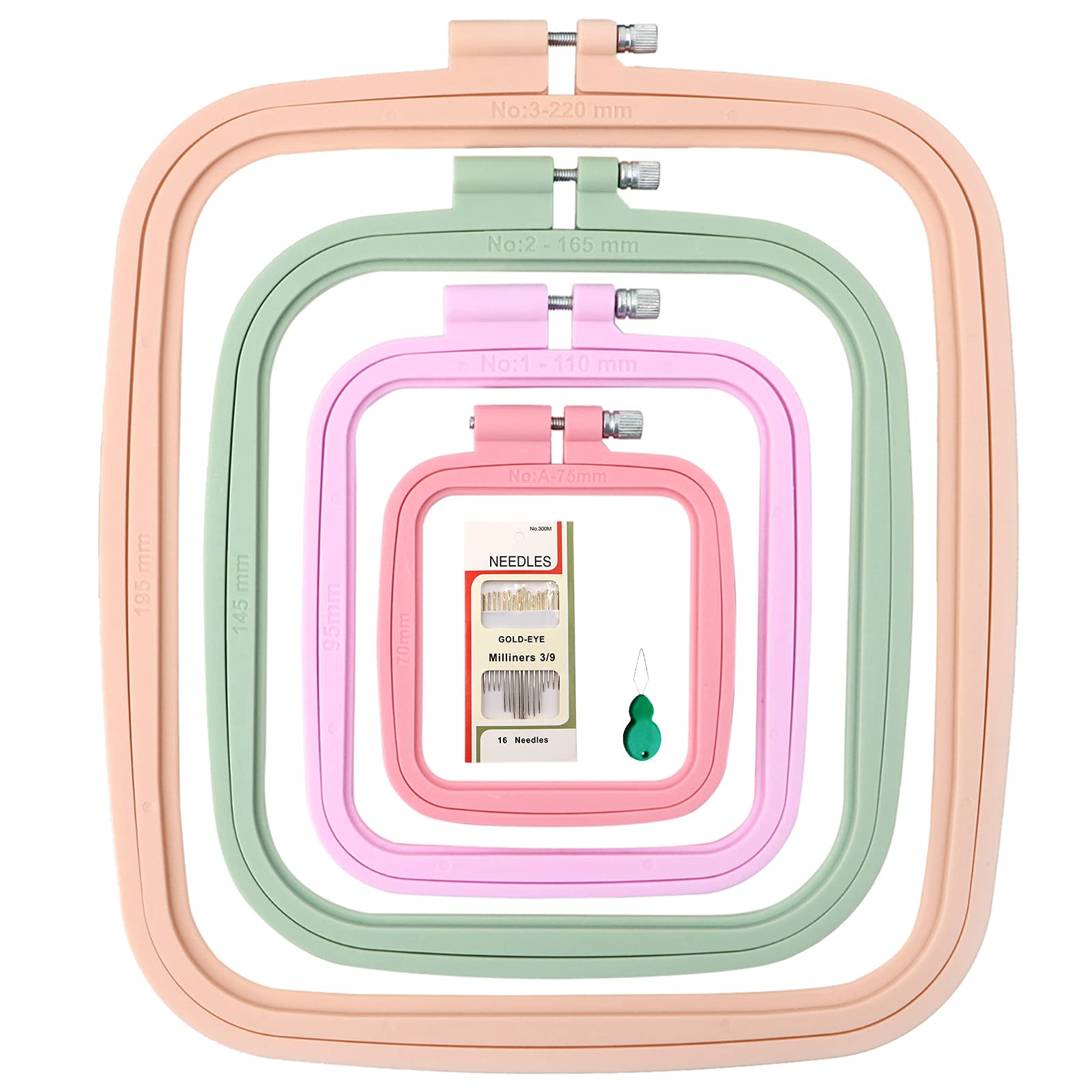 - EMBROIDERY HOOP SET: With 4PCS in a pack, our rectangular embroidery hoops have your covered with great size variety for both small and large embroidery projects (2.8x3in, 3.7x4.3in, 5.7x6.5in, 7.7x8.7in). The needle threader and embroidery needles included make a sweet addition for your needlework supplies